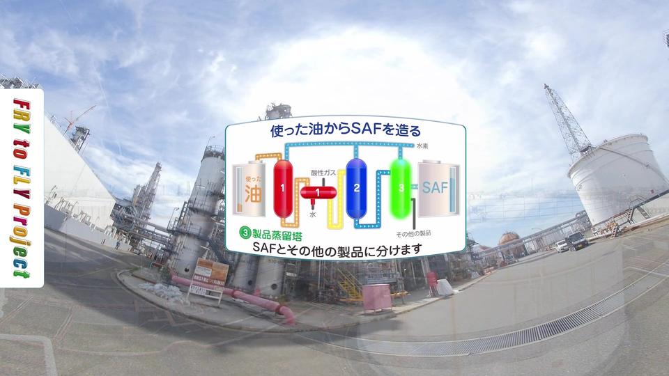 廃食用油が発生するところから、それらがどのように回収・輸送され、どのように工場でSAFとなり、どのように航空機まで運ばれて給油されるのか、普段決して目にすることの出来ないSAFのサプライチェーン全体の流れを3D VRによって、リアルに体験することが出来ます。